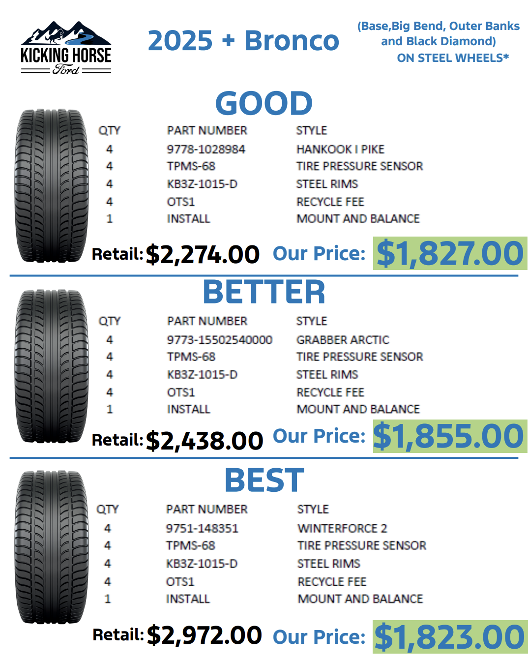 2025 + Bronco (Base, Big Bend, Out Banks, Black Diamond) on steel wheels